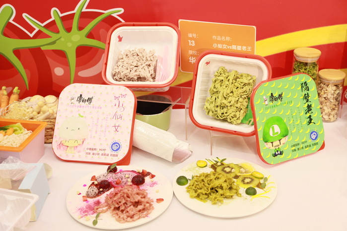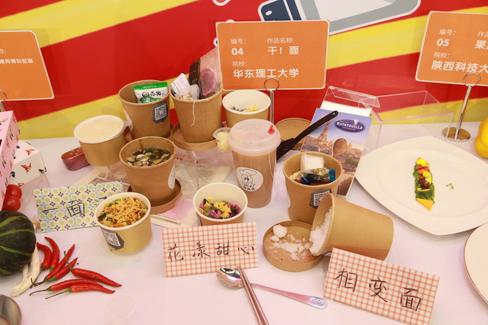 我校沈瑜团队针对干拌面倒水不便的问题设计了一款带有软塞的嵌套式双层面碗,还利用温变油墨对面盖纸作了改进,又在传统方便面的基础上制作了紫薯和菠菜非油炸面饼;吴安迪团队针对营养搭配、汤汁处理及面饼改良等方面进行了创意设计。这两组作品在决赛现场都引发了评委们的极大兴趣,也受到一致好评。