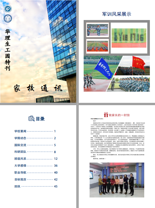 动态、国际交流、科研团队、班级风采、大学感悟、职业导航、目标简历以及师长寄语等多个板块组成,而这本刊物也得到了众多家长的认可,接近100%的家长给予了热情的反馈。