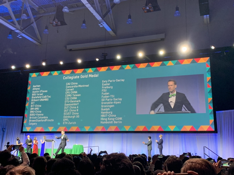 Hynes会议中心举办的国际基因工程机器大赛(International Genetically Engineered Machine Competition, iGEM)上,华东理工大学第三届代表队(ECUST_China)蝉联金奖,同时获得“生物制造”赛道最佳单项奖(Best manufacturing project),创造了我校参加这一赛事的历史记录,彰显了我校本科生理工结合的交叉创新实力和在生物制造领域的学科底蕴。