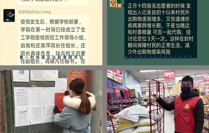 党委积极响应,根据学校部署,第一时间成立以赵黎明书记、庄英萍院长为组长的疫情防控小组。陆兵副书记亲自书写名为《打赢抗击病毒战之我见》的文章,与全院党员同志交流。鲁华生物技术所的研究生党支部在线上召开组织生活会;组织并动员支部成员捐款、捐物;拍摄疫情防控宣传视频;在家乡参加志愿者服务,默默奉献,如被称为“全村希望”的王明睿同志、与居委会一起共同张贴宣传标语的邓思敬同志等。大家始终贯彻“把初心落在行动上、把使命担在肩膀上”,积极为疫情抗击奉献自己的一份力量。