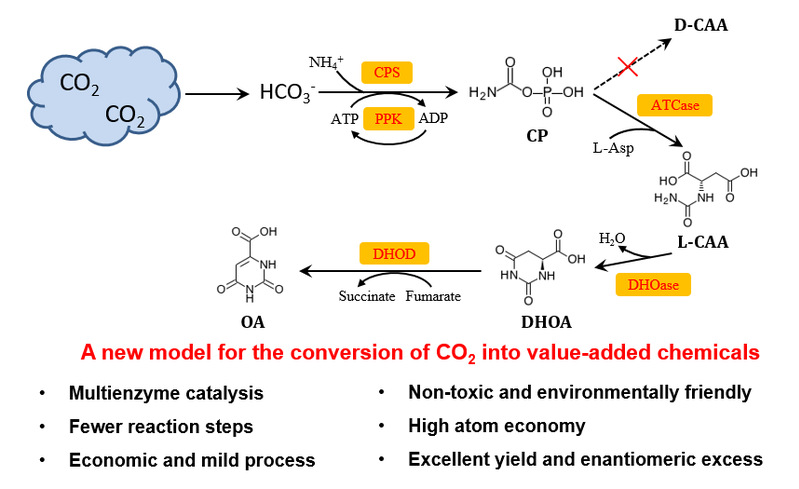 近日,我校生物反应器工程国家重点实验室李志敏教授课题组应用多酶组合催化体系,在无细胞生物合成方向取得最新进展。有关成果分别在Green Chemistry以“Towards the conversion of CO2 into optically pure n-carbamoyl-l-aspartate and orotate by an in vitro multienzyme cascade” (// doi.org/10.1039/D0GC02268C) 和Journal of Agricultural and Food Chemistry以“Efficient one-pot synthesis of cytidine 5’-monophosphate using an extremophilic enzyme cascade system” (//doi.org/10.1021/acs.jafc.0c04055)为题进行了报道。