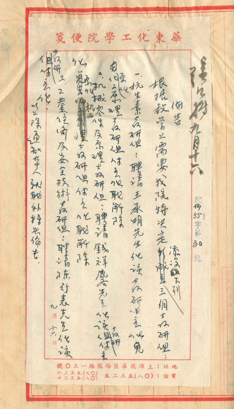 院长张江树教授、有机化工系主任冯成湜教授两人赴京讨论建立抗生素制造工学专业问题。由高教部副部长曾昭抡接见,得悉高教部、卫生部和化工部医药司鉴于我国将自力更生,大幅度增产抗生素,急需这方面科技人才的培养,决定新建抗生素制造工学专业,并属化学工学类。苏联专家建议将此专业设置在华东化工澳门金沙娱乐城