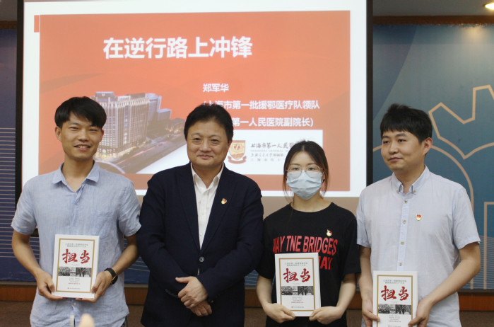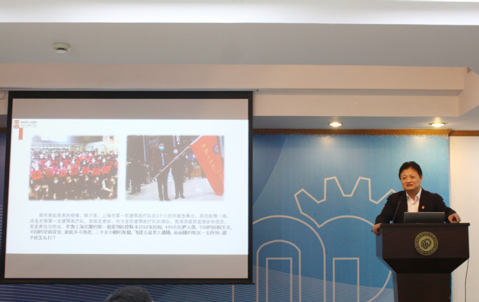 郑军华教授从组织的威力、斗争的本领、牺牲的精神、信念的力量四个方面,用朴素的语言生动详细讲述了面对突如其来的疫情,在2020年除夕之夜临危受命,带领上海市第一批援鄂医疗队在3个小时内紧急集合,驰援武汉,67天抢命金银潭,最终取得胜利的经历,用一件件具体事例和一位位人物事迹生动诠释了“生命至上、举国同心、舍生忘死、尊重科学、命运与共”的伟大抗疫精神。