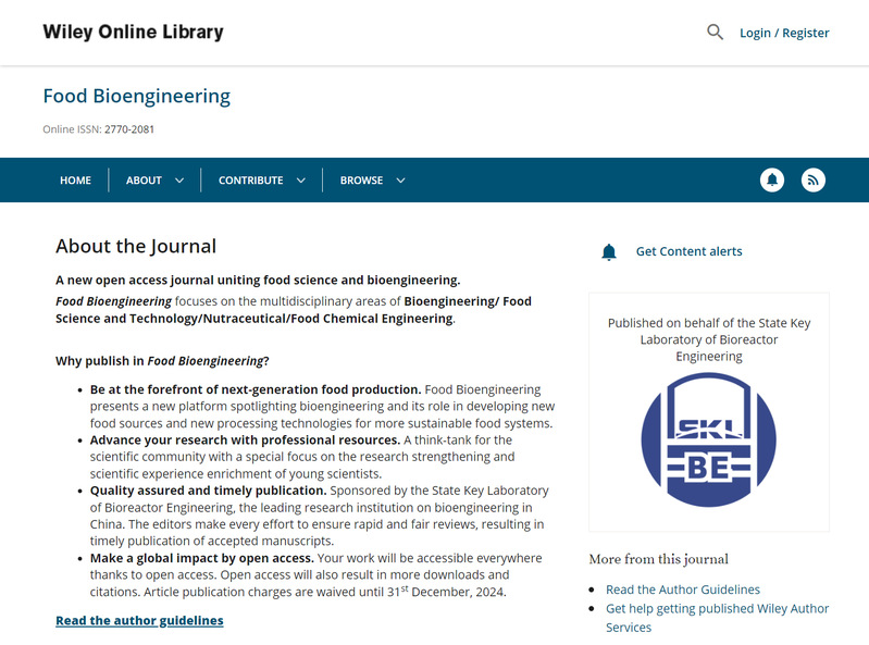 《Food Bioengineering》中文译名为《食品生物工程》,食品生物工程是华东理工大学食品科学与工程研究领域的核心特色,将生物工程理念和技术融合于“为耕者谋利、为食者造福”的食品学科更是生物反应器工程国家重点实验室坚持“四个面向”的重点方向。以国家重点实验室重组为契机,为进一步扩展“道器合一,服务农医”的国重室科研和文化内涵,拓展生物反应器工程国家重点实验室在未来食品领域的发展空间,同时进一步提升我校食品生物工程特色学科的国际影响力,促进国际交流与合作,生物反应器工程国家重点实验室与国际著名出版商Wiley合作,推出《Food Bioengineering》国际学术期刊。