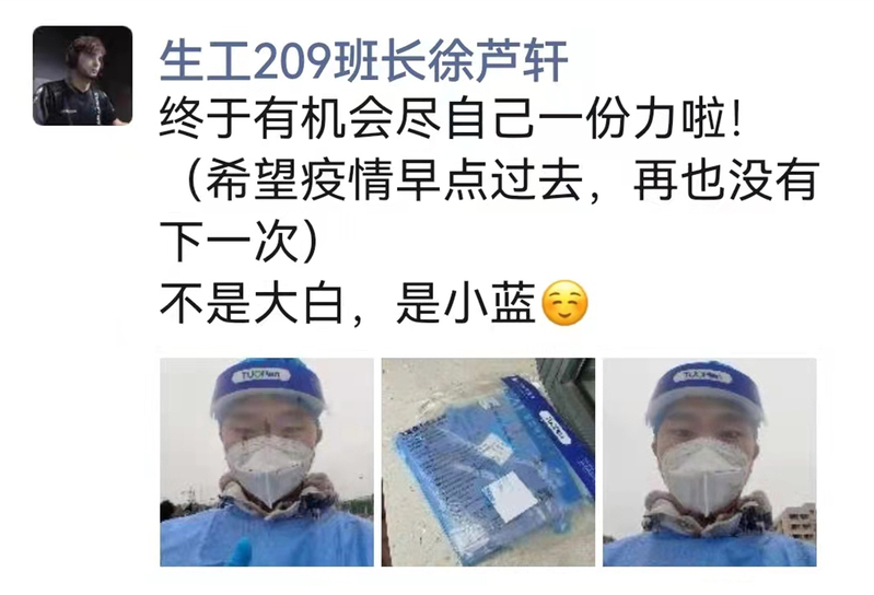 的丛家玮同学主动向老师申请参加战疫。“虽然穿着防护服送食物,爬上爬下很辛苦,虽然满场引导焦头烂额,虽然要牺牲掉休息的时间,但是在抗疫一线我收获了一份难以替代的成就感、大家的肯定、军团兄弟们在一起的众志成城。”