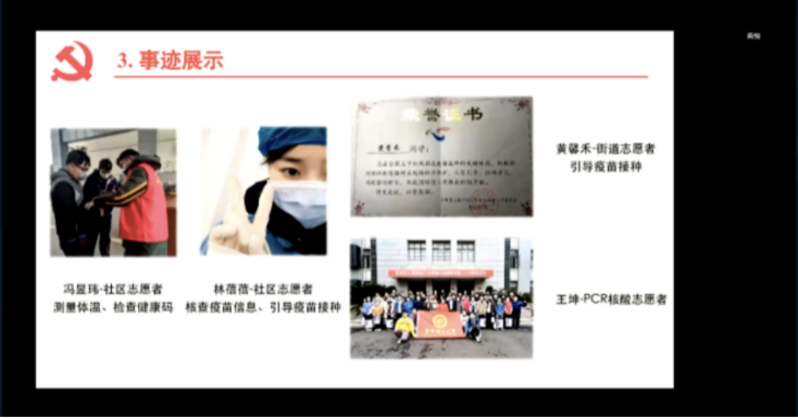 上海进入抗疫“最关键、最吃劲”阶段,疫情就是命令,防疫就是责任。会上党员同志从自身实际出发,讨论并交流在当前特殊阶段,如何更好地响应国家号召,发挥党员作用,履行初心使命。生工系教工党支部的夏杰说到,上海市疫情正处于高峰期,各位党员同志要时刻关注最新动态,作为党员要冲锋在前,善于发现问题,勇于提出问题,敢于解决问题,做好表率。来自国重室研究生第四党支部的王坤迅速响应国家号召和人民需求,主动报名华东理工大学第二批PCR检测志愿者,现已随队出征,正在一线实验室。王坤表示,很荣幸能为上海市疫情防控贡献出华理力量,虽然前线的工作很辛苦,但志愿者们敢吃苦能吃苦,大家团结一致,必将打赢这场硬仗。由于现在上海市防控形势仍然复杂严峻,他表示,作为一名党员必须以身作则,遵守纪律,服从命令,坚持就是胜利,坚持才能胜利。生物学与食品科学硕士奉贤党支部的王奕嘉同志分享了在学校封控管理期间,她与室友一起解压放松的方式,虽然很遗憾不能奔赴前线,但会在后方传播正能量。