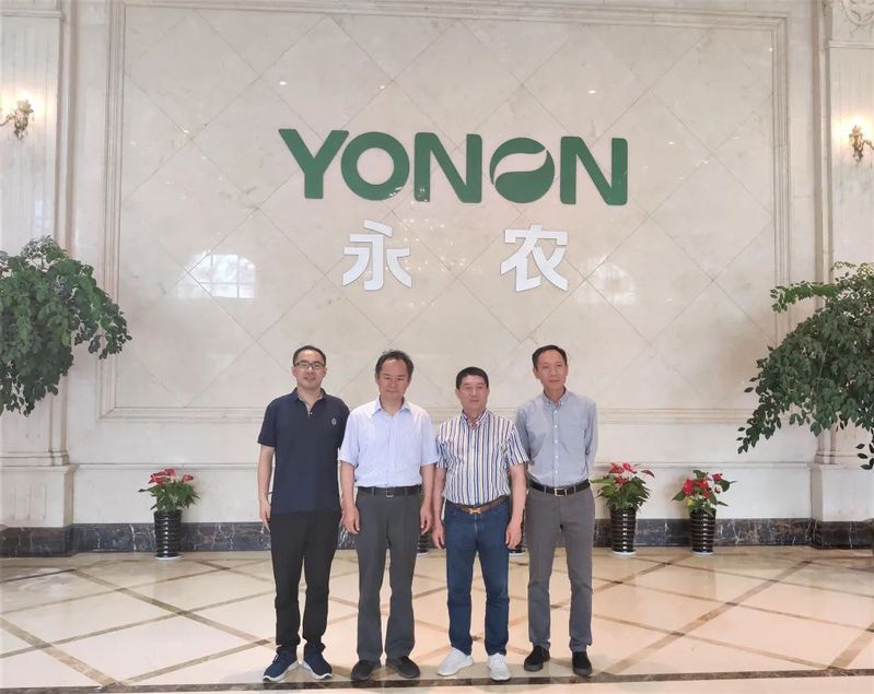 图片说明:鲁华生物技术研究所所长魏东芝教授、王华磊副教授与永农生物科学有限公司吴克孟董事长、张长雷副总经理在永农生物科学有限公司上虞工厂