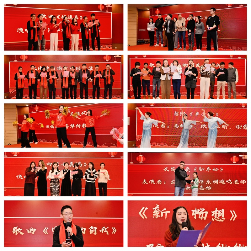 教师们多才多艺的一面。歌曲《最炫民族风》《祝你平安》《突然的自我》《年轻的朋友来相会》《小美满》给大家带来了听觉盛宴。长笛独奏《新年好》传达了节日的温馨。舞蹈《半壶纱》情感细腻、姿态优雅,展现了中国传统美学的独特魅力。诗朗诵《中国脊梁》深情而庄重,《新年畅想》充满憧憬和期盼。表演期间,趣味互动游戏和紧张激动的抽奖环节穿插其中,将大家的热情推向高潮。最后联欢会在《好运来》的欢快歌声中落下帷幕。