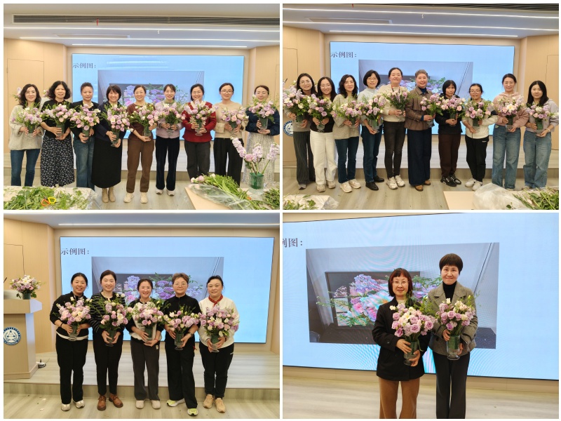 经过一个小时的精心制作,一瓶瓶独具匠心、赏心悦目的插花作品陆续呈现。大家手捧亲自创作的花艺作品,在镜头前合影留念,定格下这充满成就感的温馨瞬间。活动结束后,老师们将亲手制作的花艺作品带回办公室,将春意与美好长久留存。